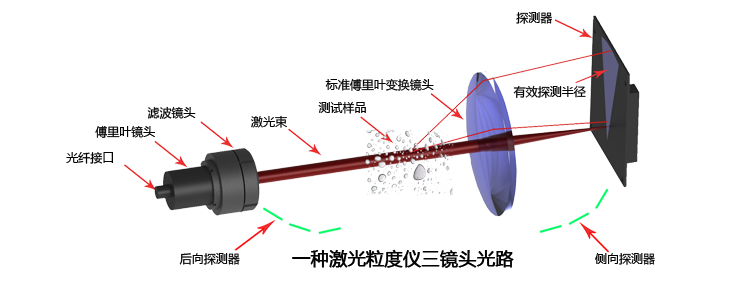 三镜头光学系统是由进口大功率光纤输出激光器、专利傅里叶镜头、滤波镜头、标准傅里叶变换镜头、前向探测器、侧向探测器组成。光纤接口接入大功率光纤激光器,傅里叶镜头把激光的发散光变成汇聚光,滤波镜头主要消除分散的杂光,让光路上的会聚光更加纯净,使仪器获得更低的背景值,测量更加准确灵敏。检测样品通过激光束照射会产生散射光信号,标准傅里叶变换镀膜镜头会把散射信号汇聚到探测器上,探测信号会更强更灵敏。